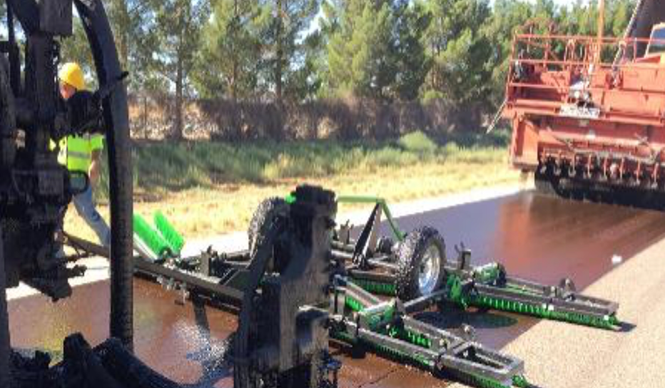 The scrub seal emulsion, CMS-1PC, was applied at 0.31 gallons per square yard, followed by a scrub seal broom (Greensbroom) and aggregate which was applied at 16-18 pounds per square yard. The micro surfacing was applied at 25.5 pounds per square yard using CQS-1HP emulsion at a rate of 12.5% with a Type III aggregate at 25.5 pounds per square yard. All aggregates were provided by Interstate Rock Products, and emulsions came from Ergon’s Las Vegas, Nevada, facility.